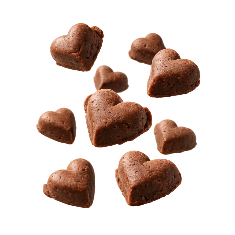 Soft, rich fudge with a deep chocolate flavor, shaped into perfectly portioned hearts. This is not traditional chocolate. It is real fudge with a dense, slightly grainy texture that melts smoothly and evenly.